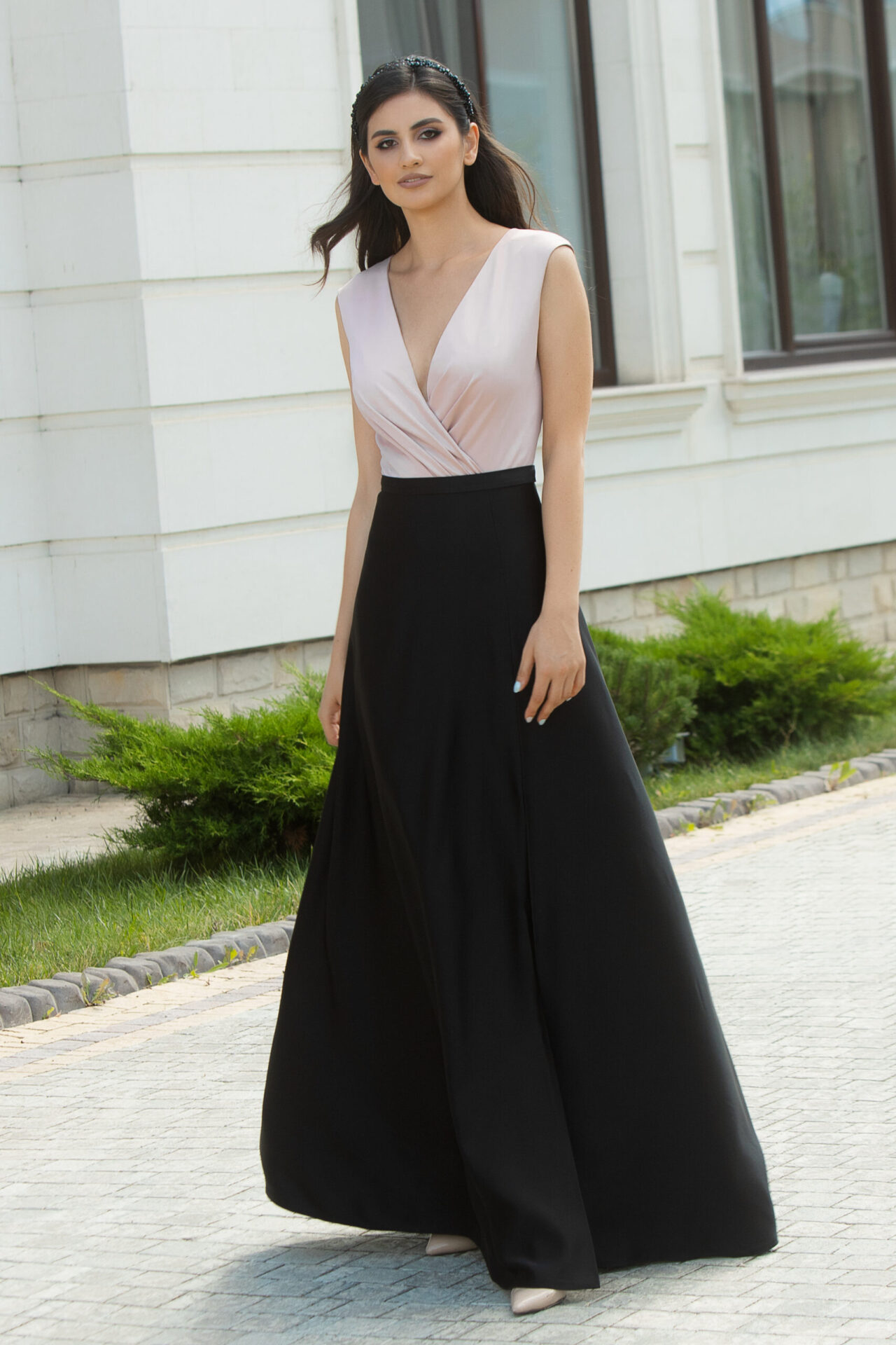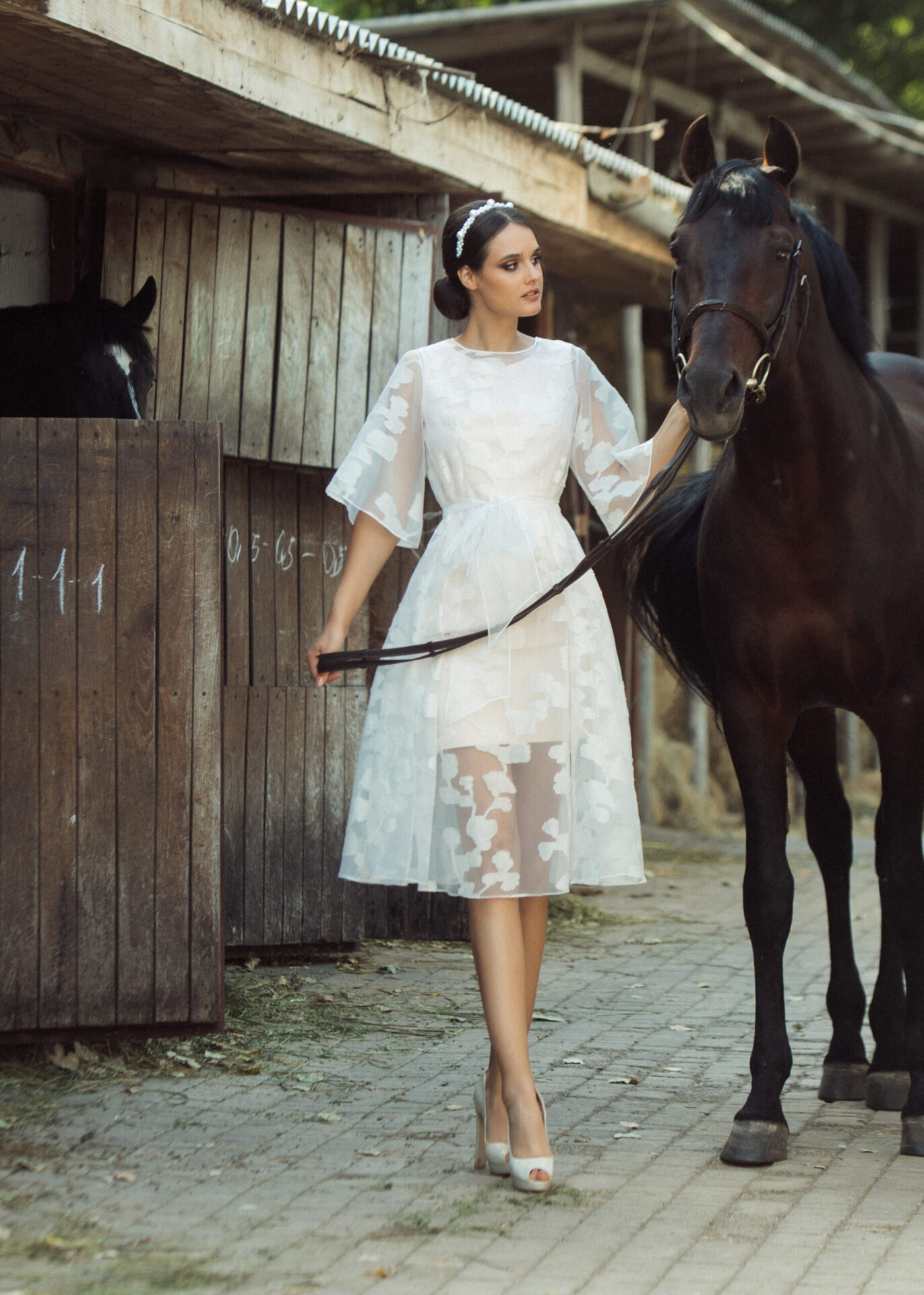This is an elegant dress with a loose fit and short sleeves. The curly line of the skirt bottom is framed away with ruffles. The V-cut neckline is decorated with embroidery.