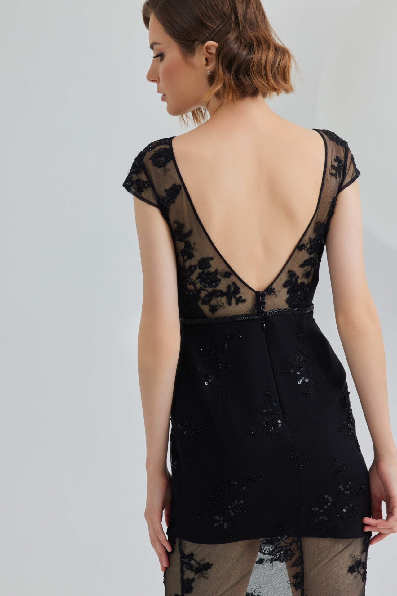 Rochie de seară pudrată, compusă dintr-o rochie tip creion și o rochie cu o capă atașată realizată din organza contrastantă. Mânecile largi și evazate se potrivesc perfect cu fusta în stil clopot.